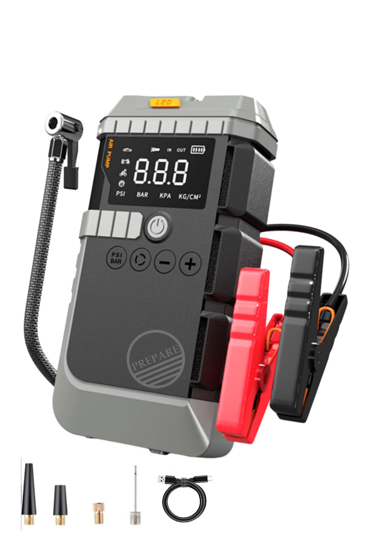 PREPARE Akü Takviye Cihazı Lastik Hava Kompresörü Uyarı Işıklı ve Powerbanklı 12.000 mAh Şarjlı 4ü 1 Arada Taşınabilir Set
