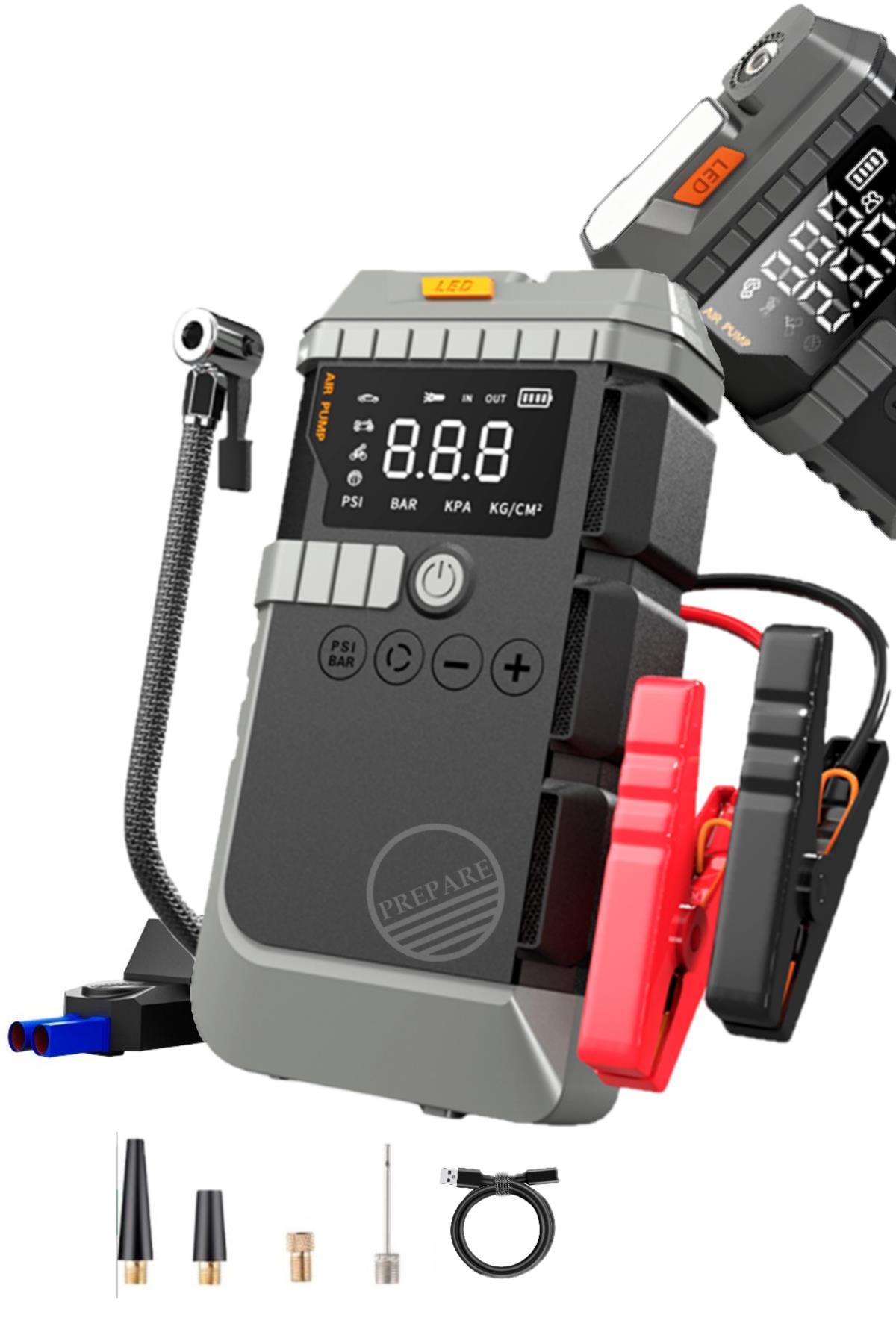 PREPARE Akü Takviye Cihazı Lastik Hava Kompresörü Uyarı Işıklı ve Powerbanklı 19.800 mAh Şarjlı 4ü 1 Arada Taşınabilir Set