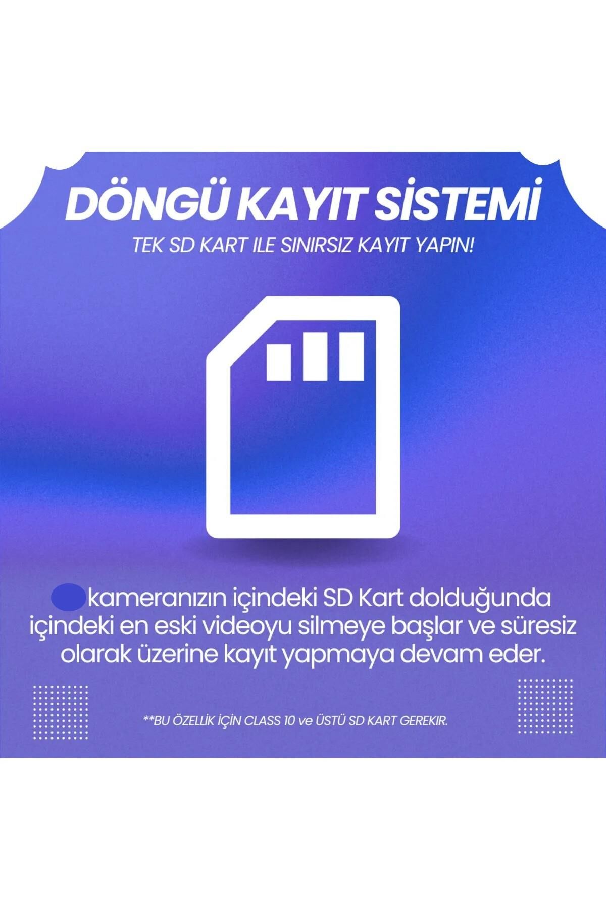 SD kart ile sınırsız döngü kayıtözelliği sayesinde eski kayıtlar otomatik olarak silinir, yeni kayıtlar daima hazır olur.
