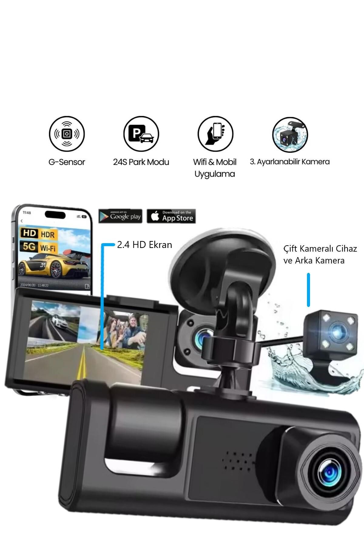 Araç Wi-fi Güvenli Sürüş Kamerası SHD Ön İç Arka 3 Kameralı G-sensör Mobil Uygulama İle Kolay İzleme