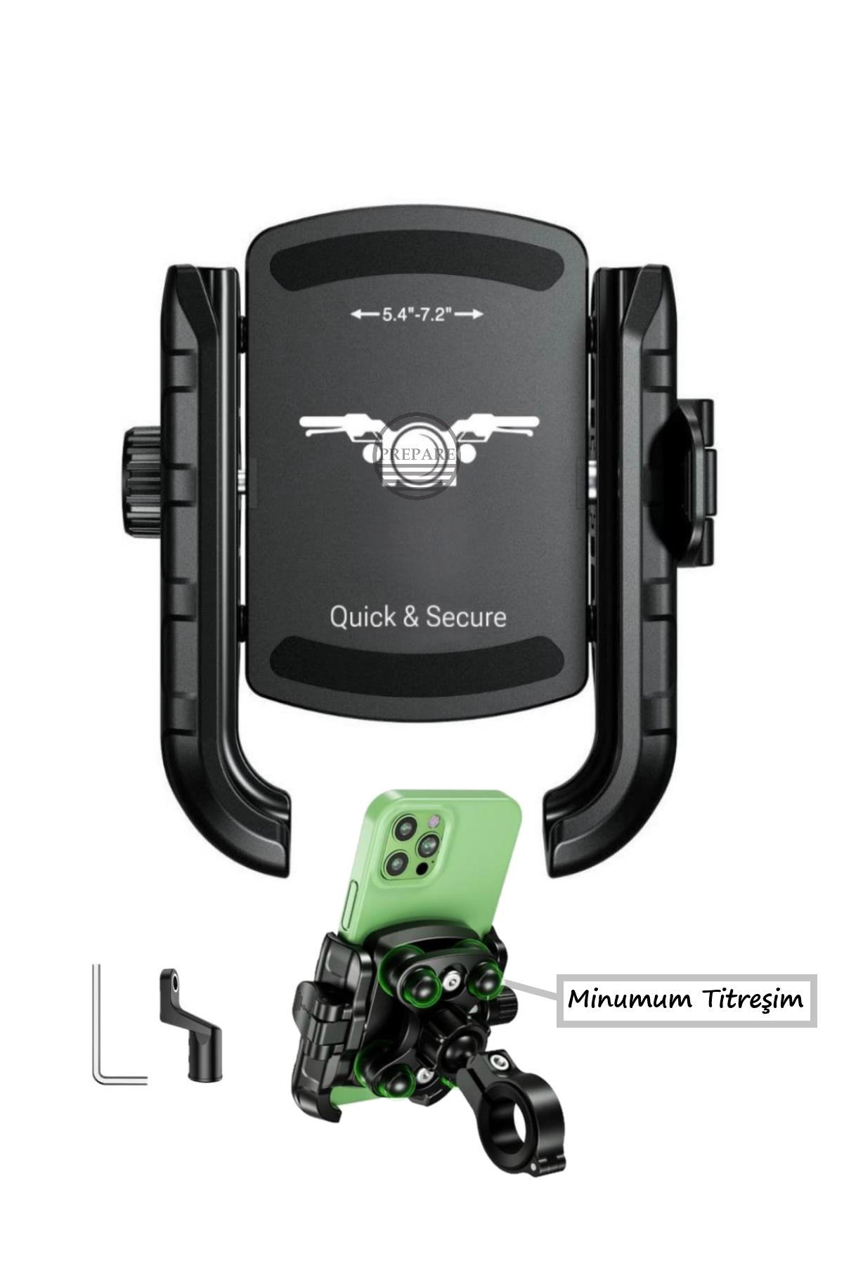 - PREPARE Motosiklet Profesyonel Telefon Tutucu Ayna ve Gidon Uyumlu Sıkmalı ve Mandallı 360 Derece Metal
