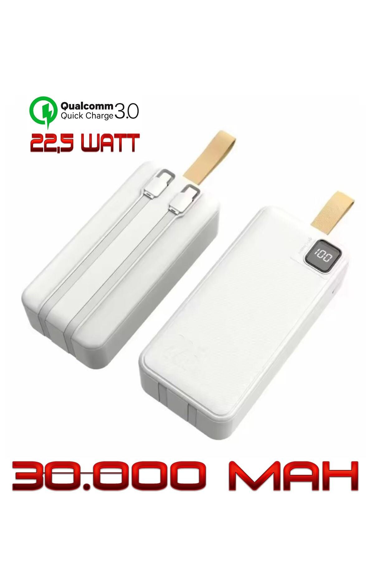 Powerbank 30.000 mAh 22,5 Watt PD Qualcoom Fast Hızlı Şarj Dahili Kablolu Powerbank