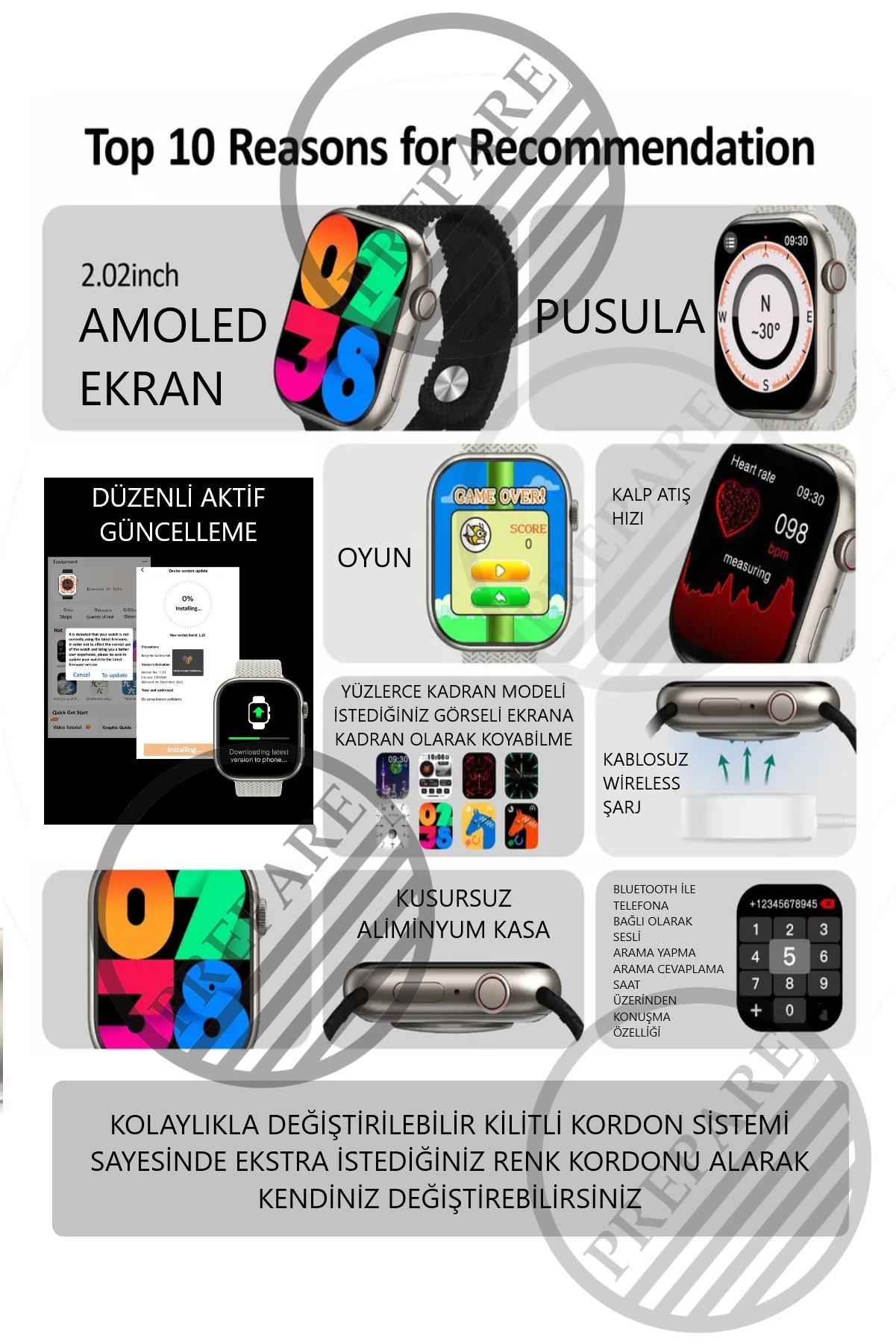 PREPARE Watch 8 PR-9 Pro Amoled 45mm 1,9 inç Ekran Pusulalı Vidalı Kilitli 2 Kordon Akıllı Saat